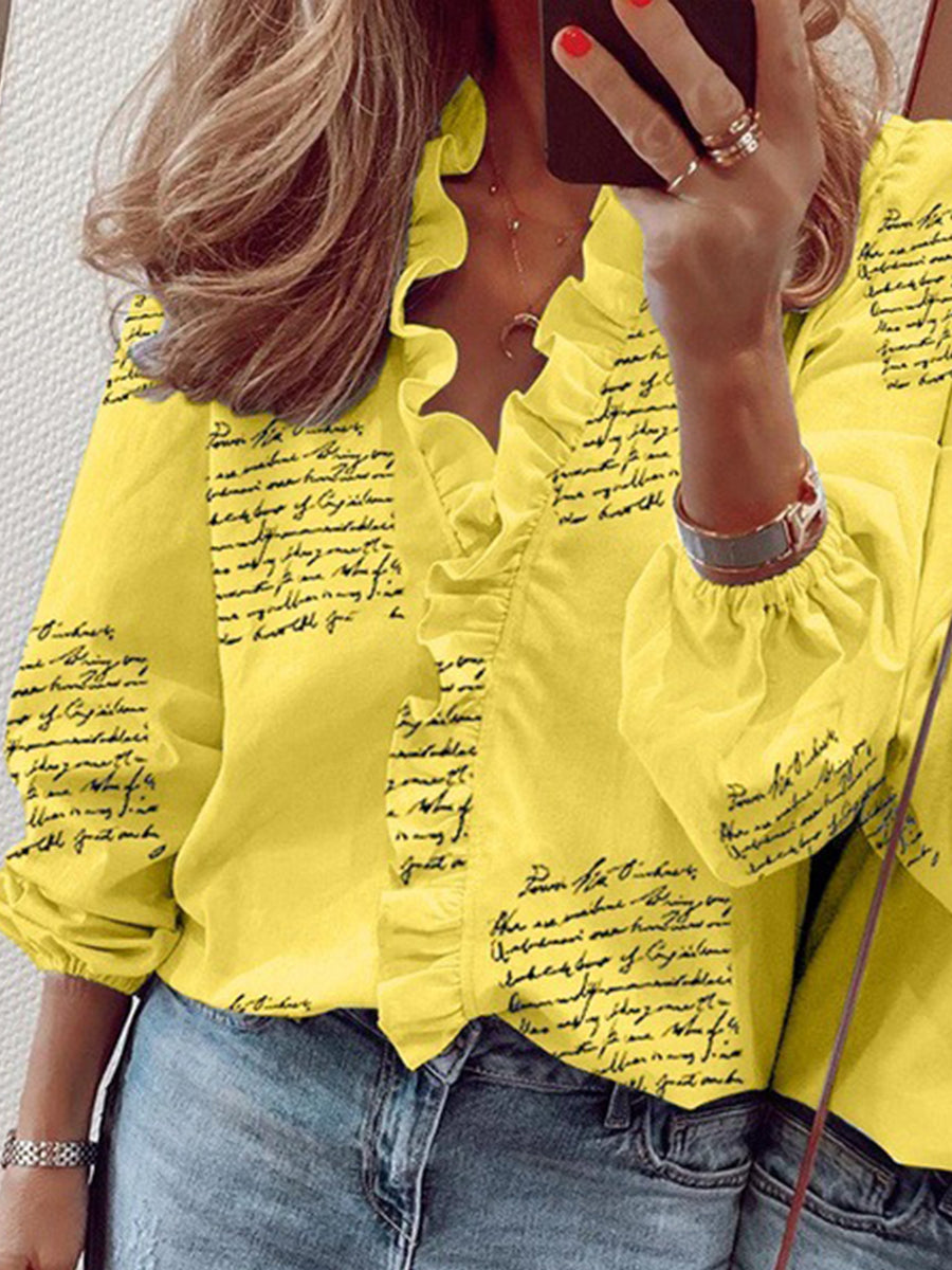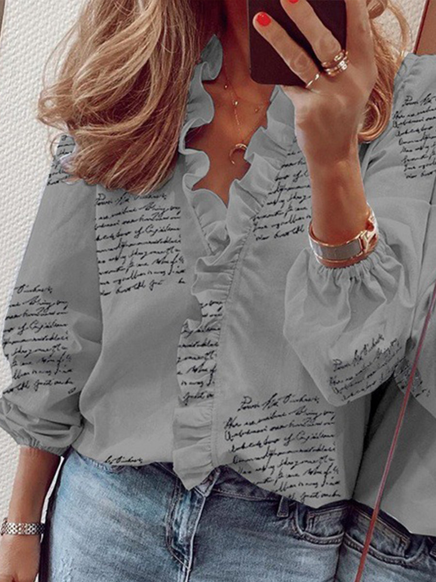 Дамски случайни разбъркан дълъг ръкав v-neck писмо печат дамска риза