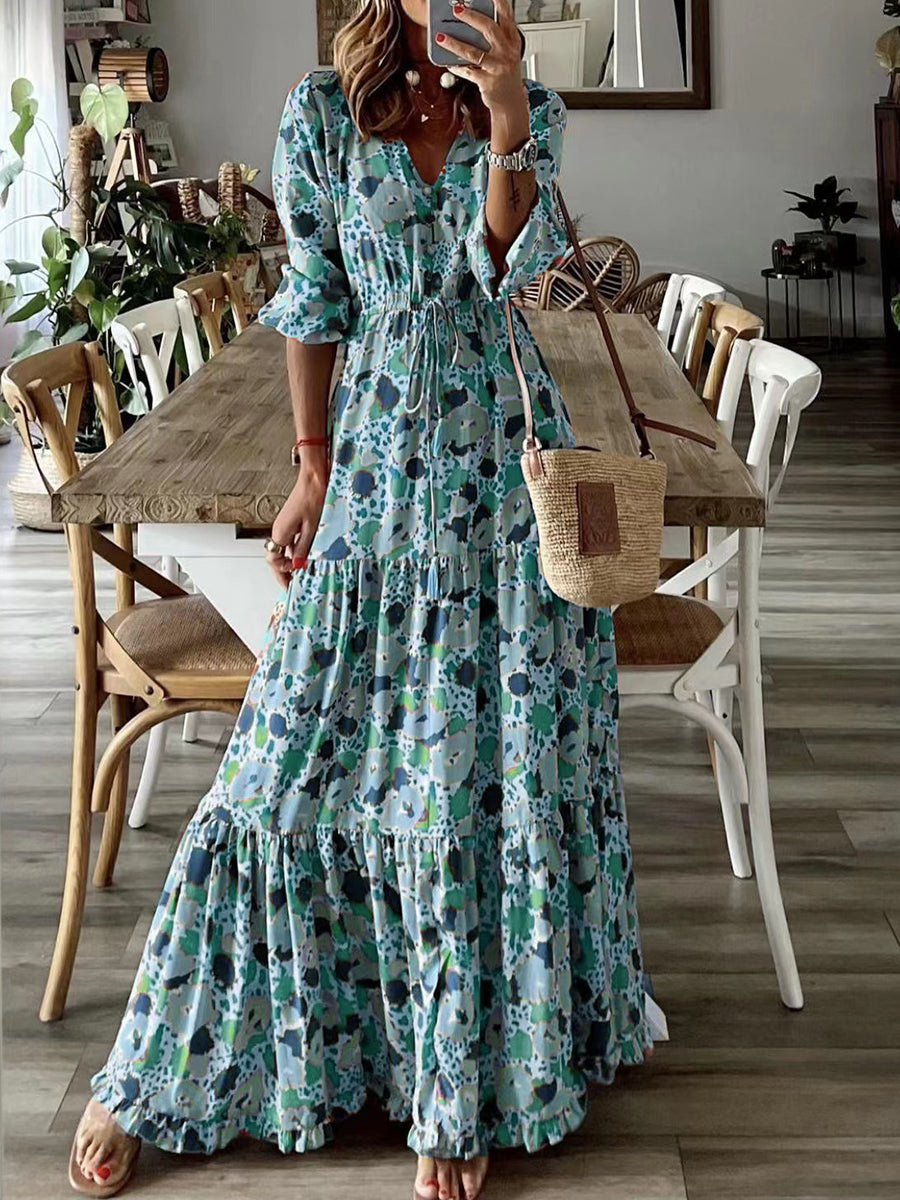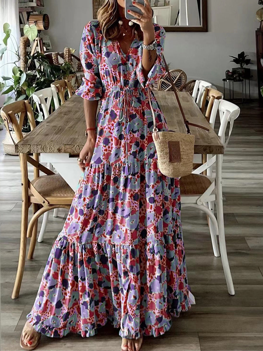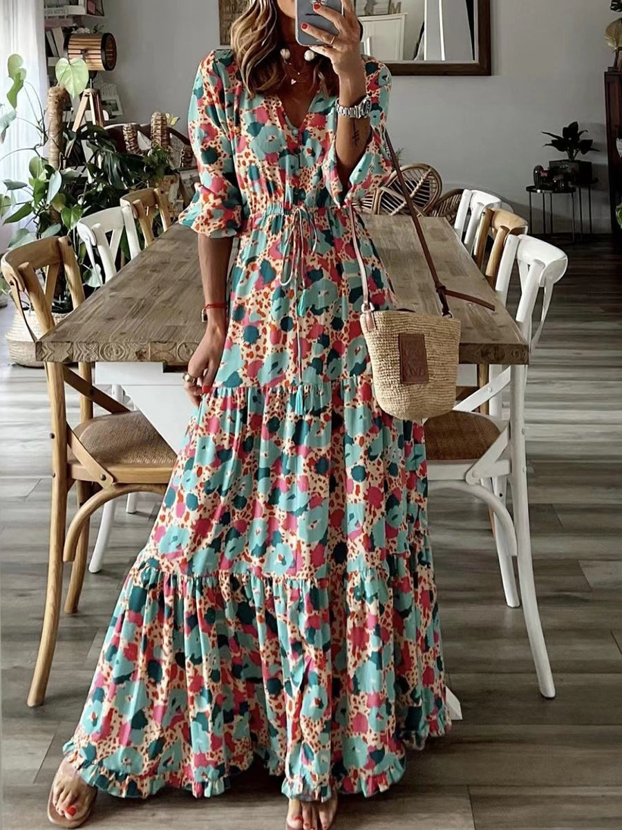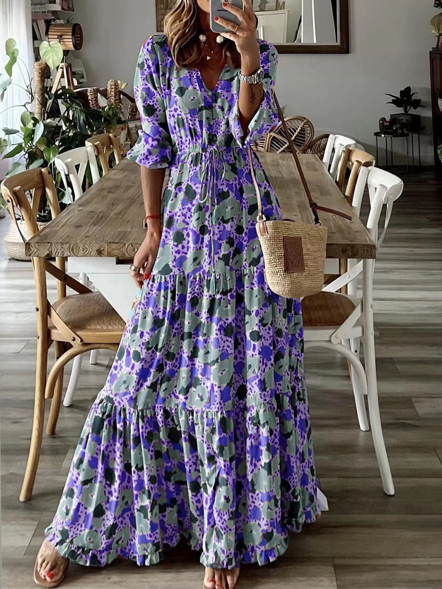 Дамски случайни v-neck изкуство печат дълга hem рокля