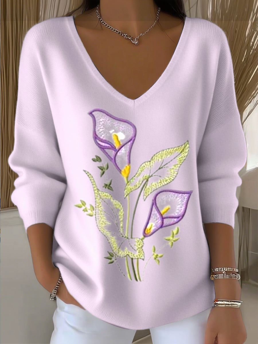 Жените прости и красиви подкова цвете бродерия светлина лилаво v-врата цвете бродерия пуловер