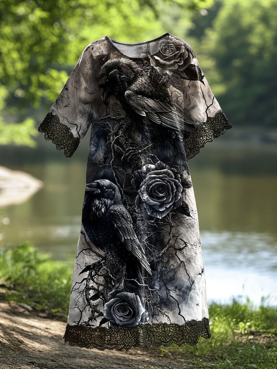 Жените реколта врана изкуство печат случайни памук дантела midi рокля
