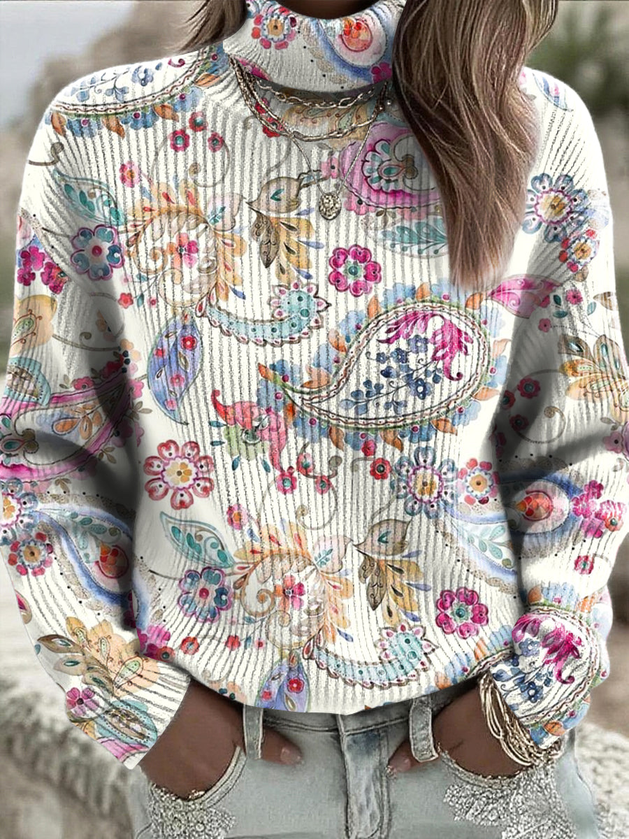 Жените реколта paisley флорални изкуство пуловер с висока врата