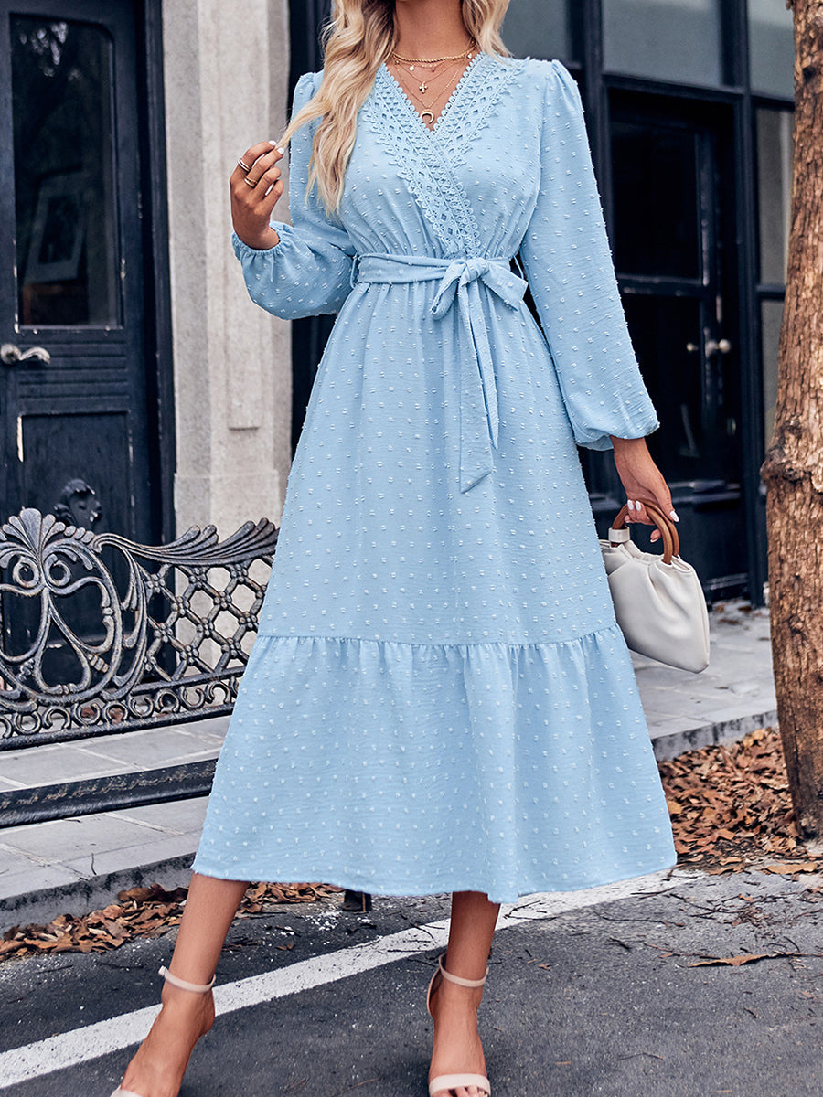 Жените ретро плътен цвят v-neck дантела талия midi рокля