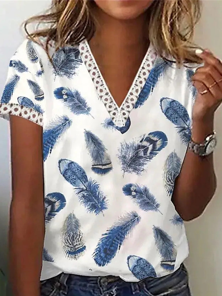 Жените случайни v-врата перо печат къс ръкав топ тениска