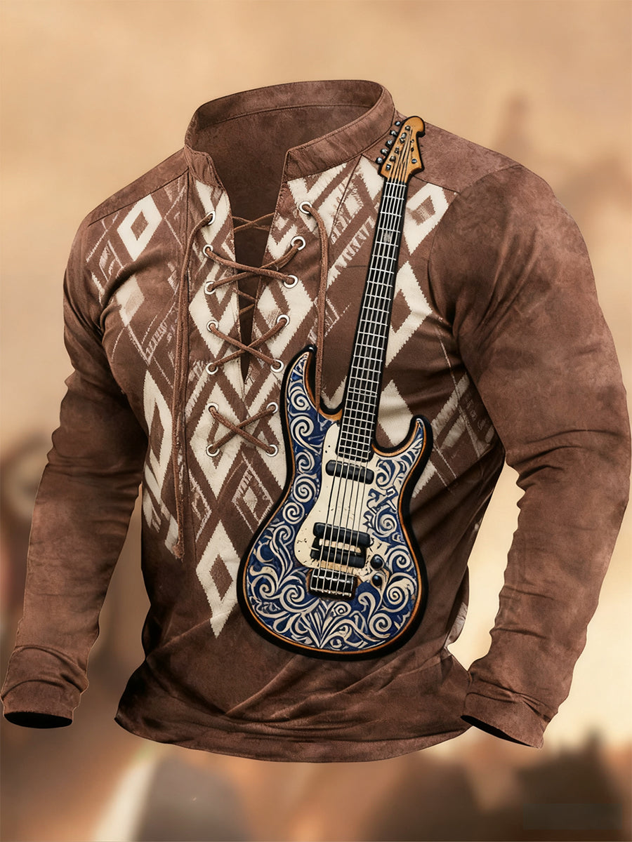Реколта западна изкуство печат страна стил v-врата henley с дълги ръкави риза