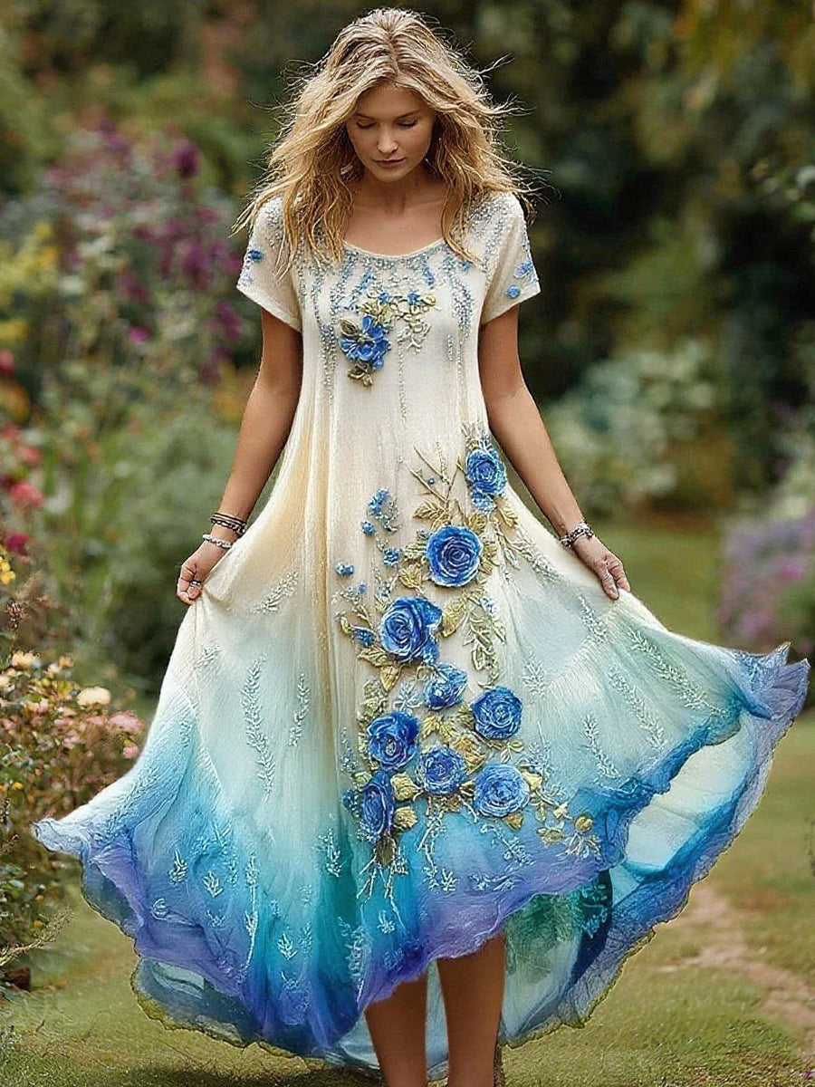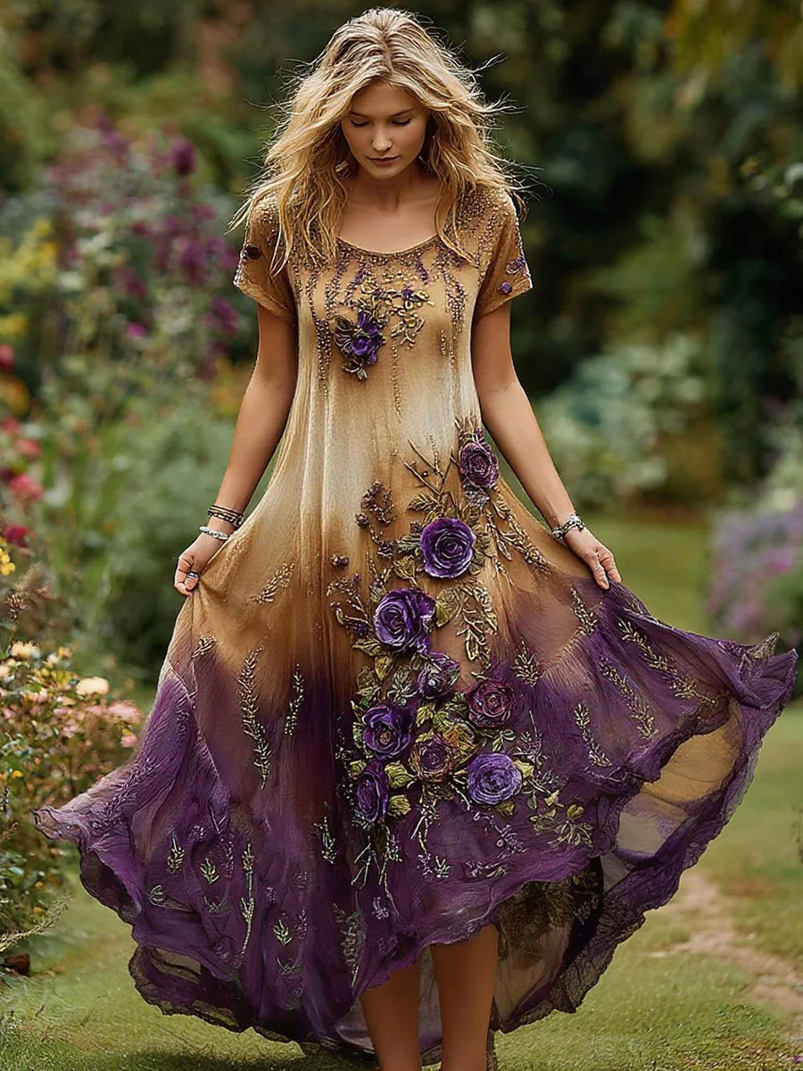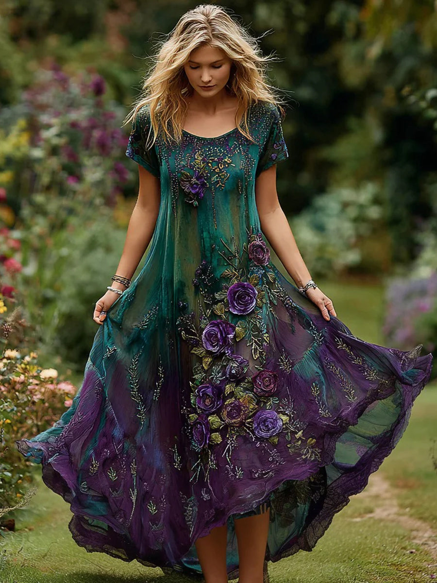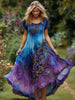 Ретро цветни изкуство печат реколта около врата къси ръкави памук maxi рокля