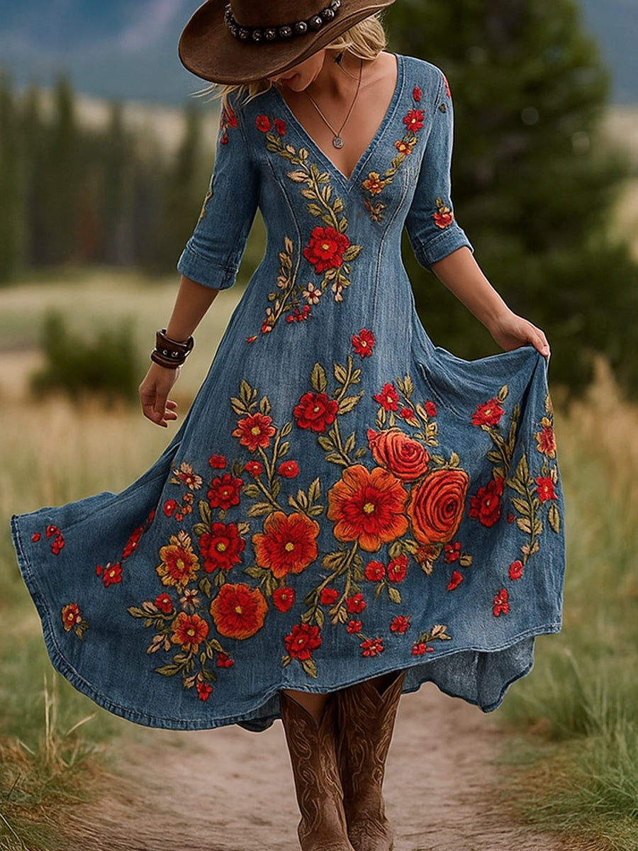 Ретро цветни изкуство печат реколта v-neck с дълги ръкави памук макси рокля