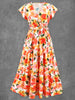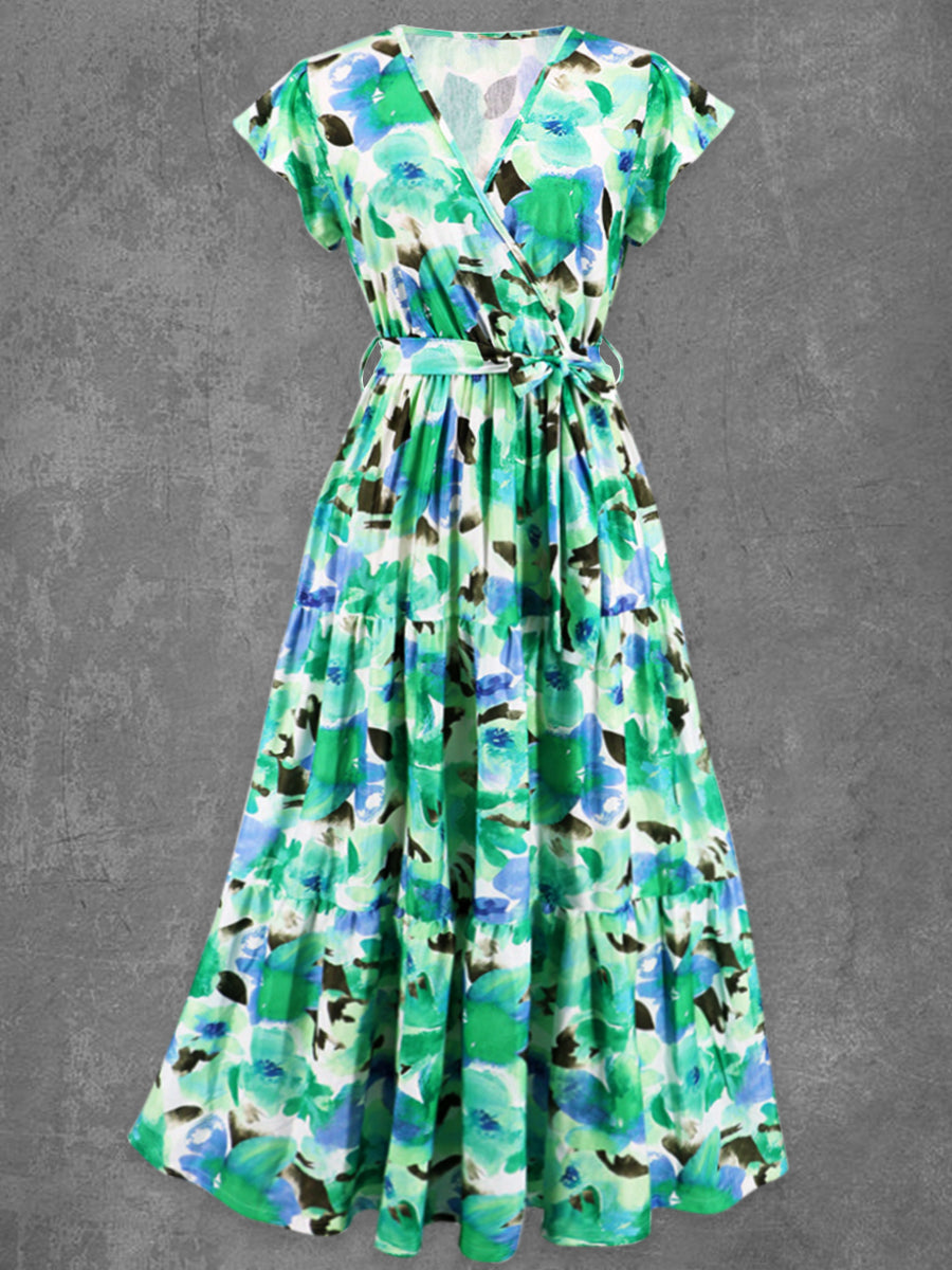 Ретро glam флорално изкуство печатни v-врата реколта шик каишка къс ръкав макси рокля