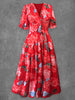 Ретро glam цветни изкуство печат реколта шик v-врата бутон нагоре средно дължина ръкав midi рокля
