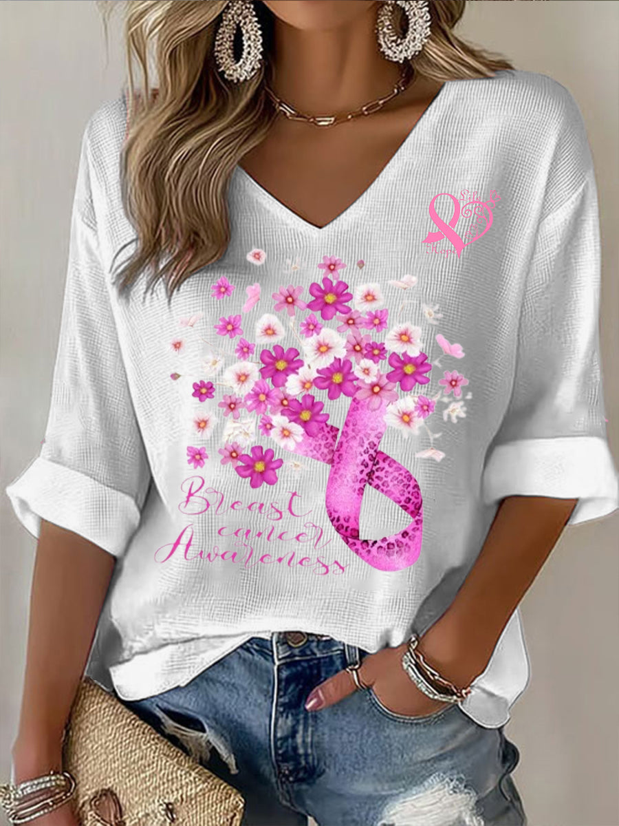 Жените маслиново рак на гърдата панделка печатни v-врата с дълъг ръкав