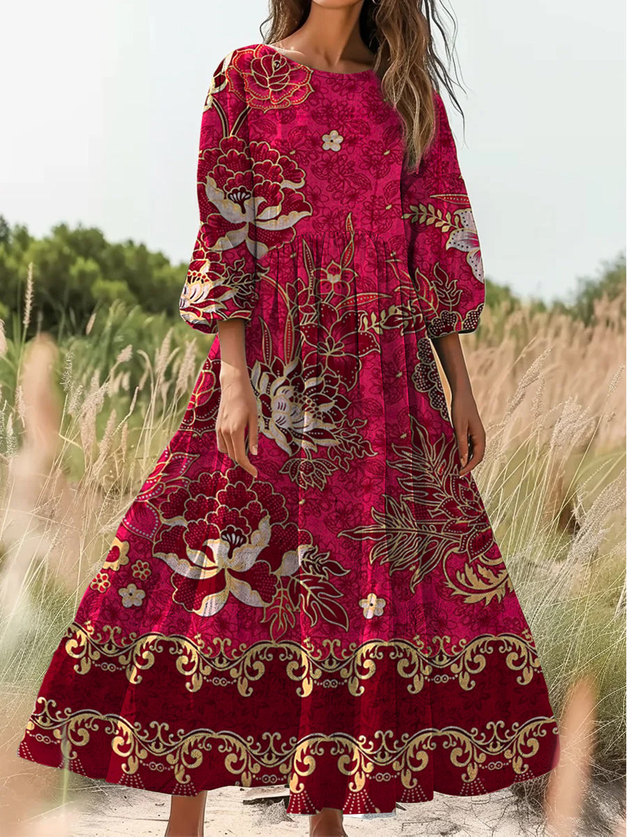 Ретро бохо цветен печат реколта шик кръгла врата памук с дълги ръкави midi рокля