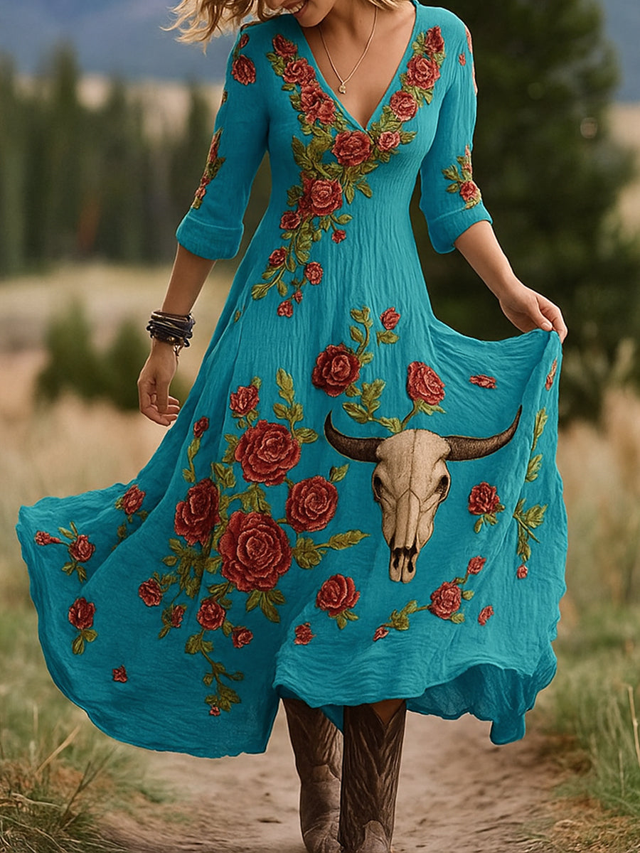 Ретро цветни изкуство печат реколта v-neck с дълги ръкави памук макси рокля