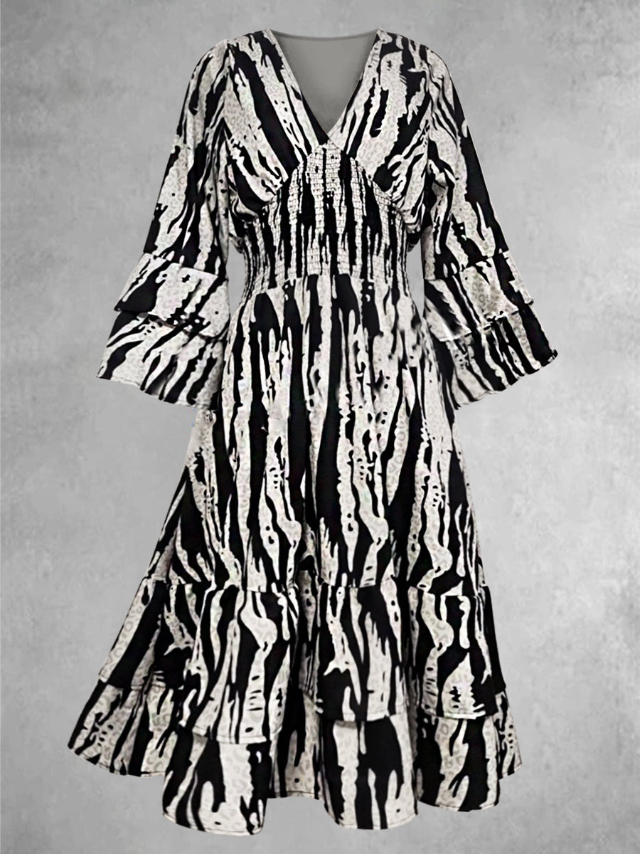 Ретро glam флорален печат реколта шик v-врата еластична талия многослойна средна дължина ръкав midi рокля