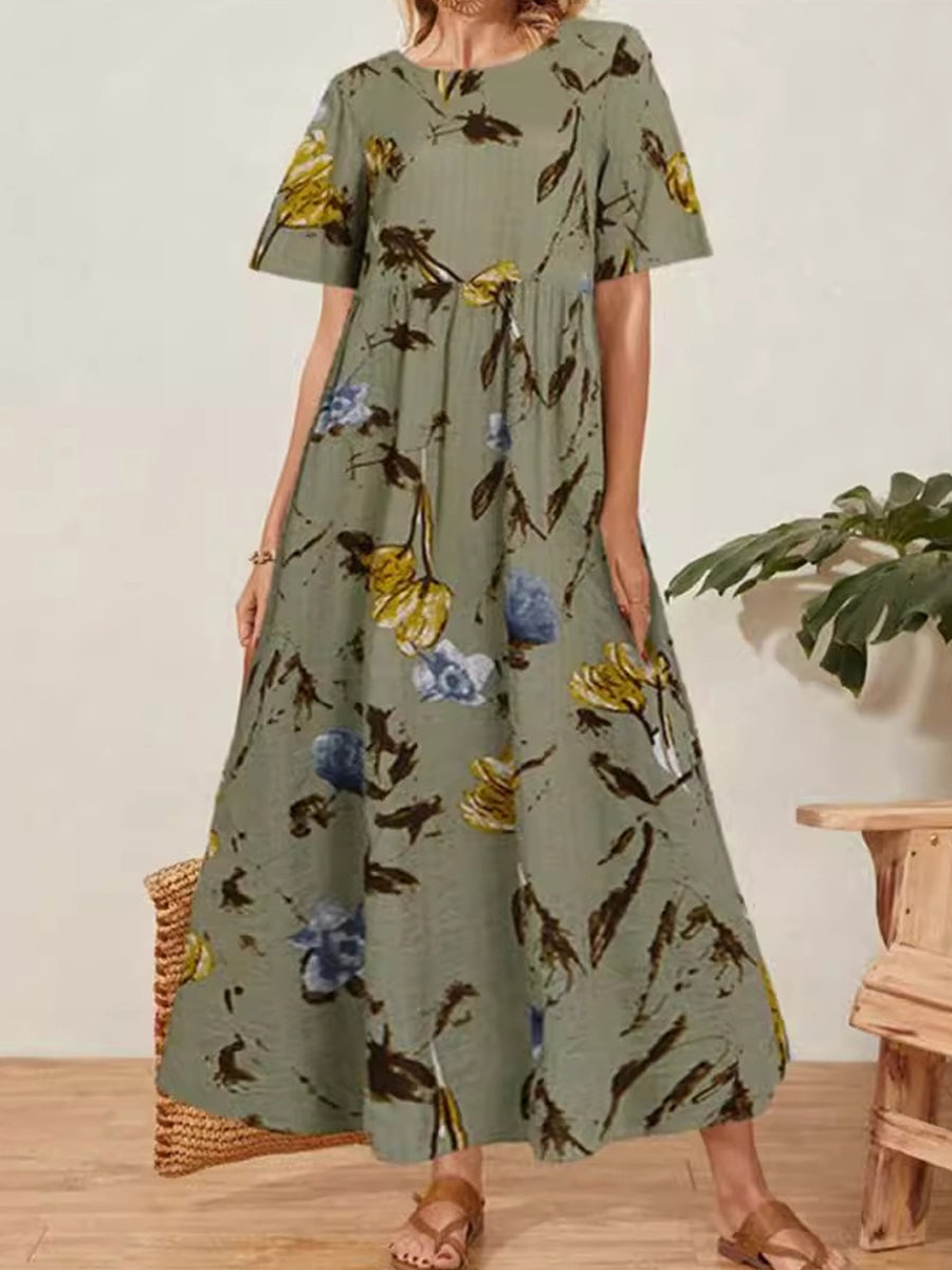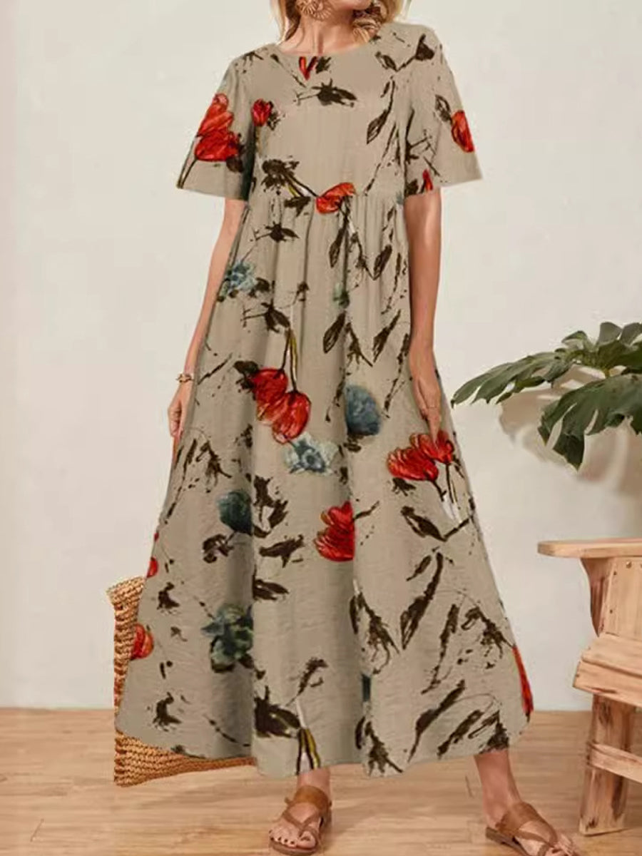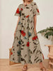 Жените ретро флорални изкуство печат около врата къс ръкав дълга рокля