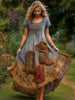 Ретро цветни изкуство печат реколта около врата къси ръкави памук maxi рокля