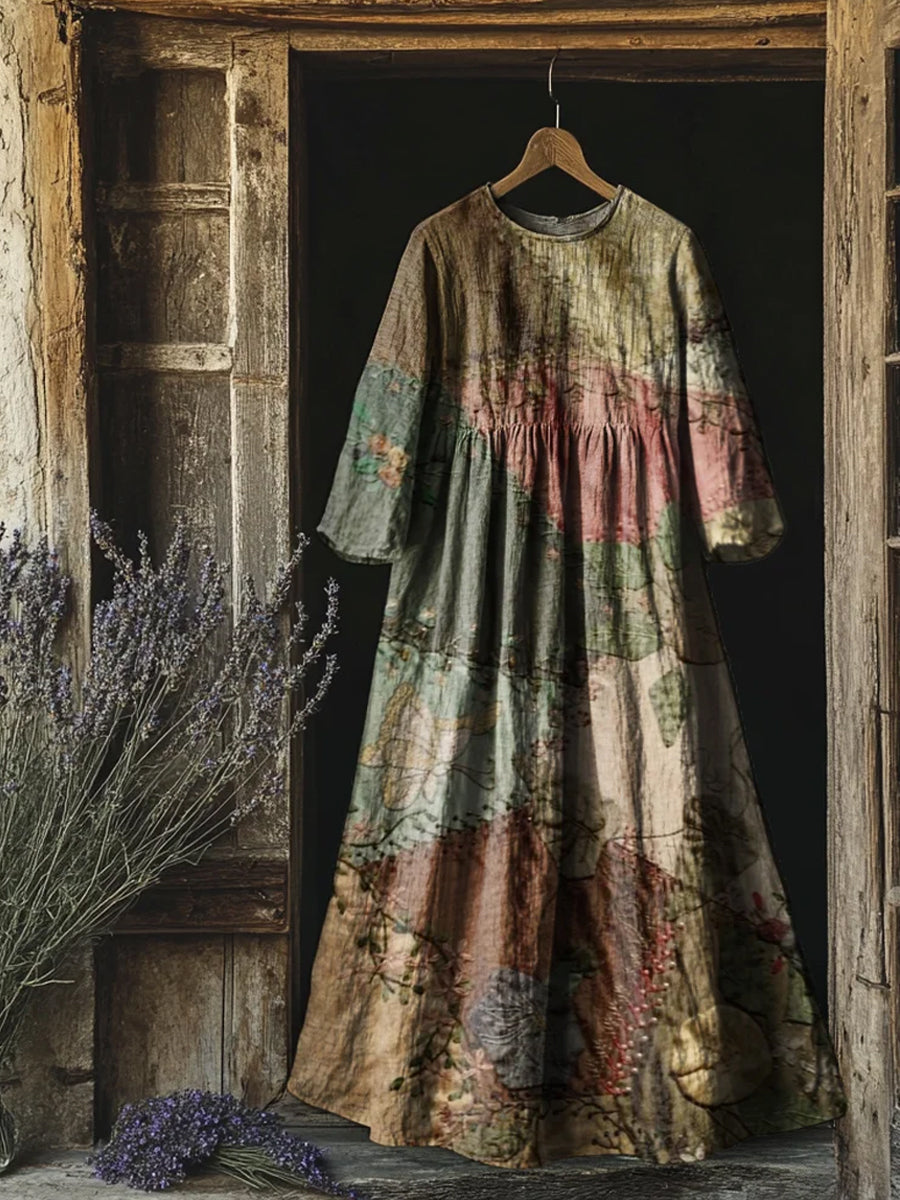 Ретро бохо цветен печат реколта шик кръгла врата памук с дълги ръкави midi рокля