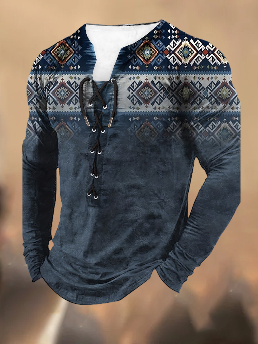 Мъжки ретро етнически печат висока яка половин цип дълъг ръкав отгоре