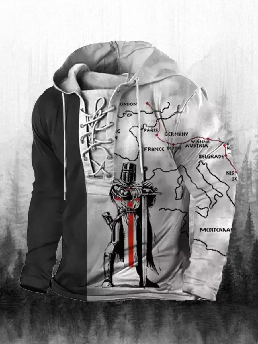 Мъжки ретро печат случайни дълги ръкави качулка суитчър отгоре