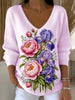Жените розово цветна бродерия v-врата пуловер