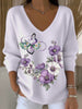 Дамски темперамент лилаво цветна пеперуда бродерия v-врата пуловер