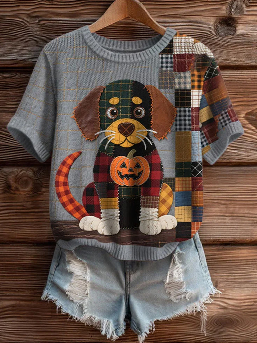 Жените артистични животински печат удобен плетене с къс ръкав отгоре